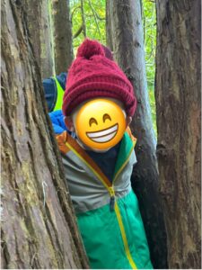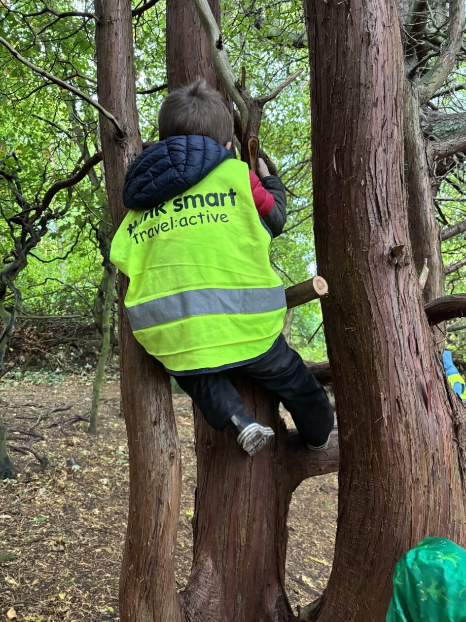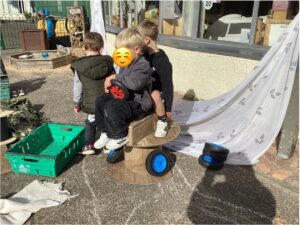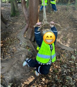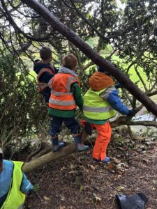 Today in the forest a group of children were exploring the trees and used their imagination to role play. “We’re pretending it’s a space ship.” “We’re the space men.” “We’re going to play climbing.”