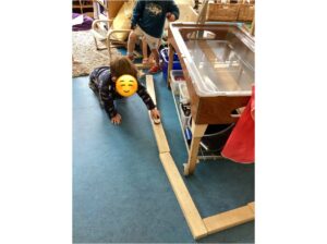 Today a group of children worked together building a model with wooden blocks. “It’s a swimming pool, no it’s a lollipop”. “ It’s a swimming pool.” “It’s a swimming pool with a diving board.” They worked together to show others how to use the blue stool as a diving board.  Lots of laughter when using it.  Good imagination and building skills shown by all children.👷🏼‍♂️