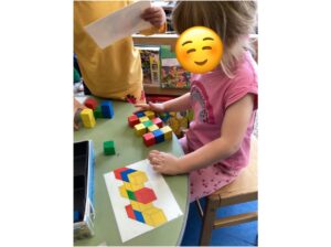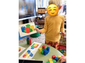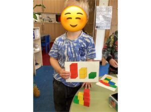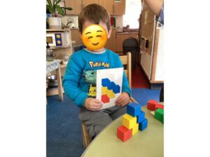 Children have joined in with a colour pattern game as they have to copy the patterned structure on the picture. Everyone worked really hard to match the colours and could recognise when they had made a mistake and worked to correct it with little support. The children requested trickier structures as they went. This opened up the conversation about positional language, height, colour patterns and symmetry.