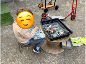Others were seen developing their mark making skills using sand instead of paper, some developing their early reading skills to match names whilst helping to prepare a game for the adult. while some have revisited previous learning when discovering lots of different insects and bugs. They found a green shelled woodlouse, which they further extend the interest to learn more about this creature called a Rose chafer. A group played a game of Pokémon card hunt, demonstrating skills to search, listening to advice and using directional language, following the rules of the game and working well with others to problem solve how to reach the card that had blown out of the garden setting.. Outside one child enjoyed sharing his knowledge of the clouds and how the rain comes down, then strops, then goes slow or fast demonstrating using the sand falling onto the truck..