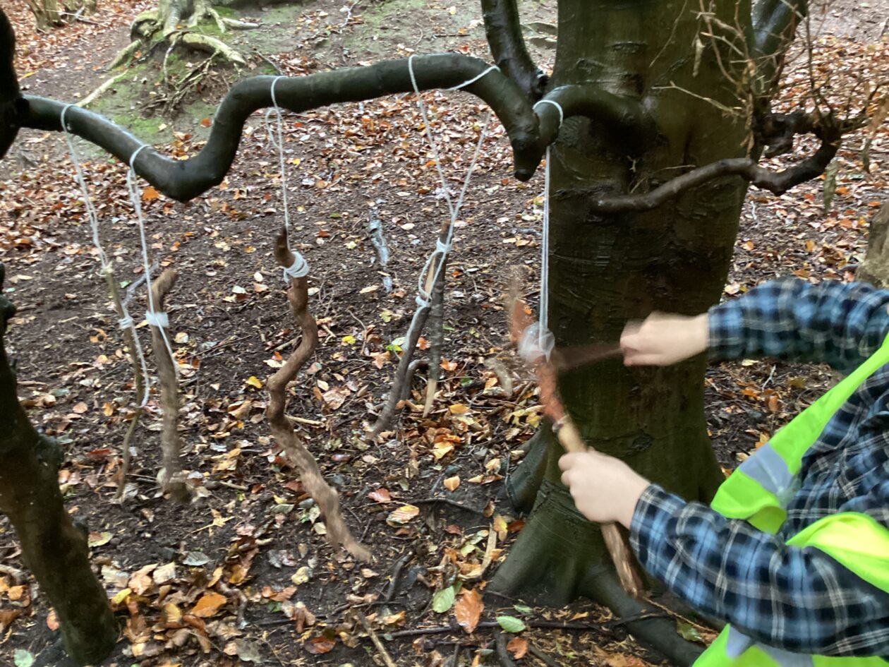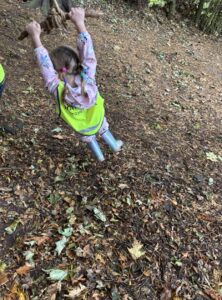 At the forest this all the children were fully engaged in a range of play experiences. We had some children showing concern for the monster head that had somehow fallen over and was missing bits. They felt sorry for him so they helped to put him back together again. Another group was seen using their gross motor skills in using the rope swing to twist and turn to see who could do the most. We observed lots of tree climbing skills with discussions on  being safe. They enjoyed a warm snack of beans and pitta bread, along with a drink of warm milk or water .One child then began to use sticks to drum, this then led to a music wall created using string and a selection of sticks, which resulted in a round of queen songs being sung.