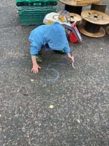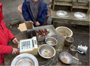 Outside this week we have been observing lots of mark making using the chalk and water to create a range of lines  and talking about directions, letters or numbers. In the mud kitchen they have been using  a range of loose natural parts such as conkers, cones, leaves and lavender using skills to mix, weigh and to cut up the lavender. They then created a restaurant adding a till and money to extend their play learning.