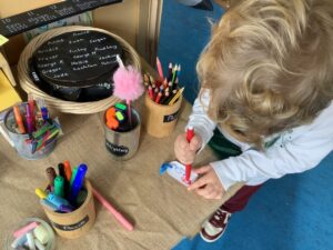 Today inside a group of children have been creative in demonstrating different skills. They used fine motor skills and independently manipulated small tools by using the scissors to cut pictures. In the writing area a group of children used different colours to create a picture for family members. They drew around their hand and proceeded to use lots of colours to create a beautiful picture for their sister. Today a group of children got creative in the art area and painted some card. They used their imagination and said “it’s got a car inside for my party tomorrow.” They pretended that the card was wrapping paper and there was a present hidden inside. 🎨