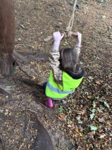 Today in the forest a group of children discussed turn taking as they created a line at the rope swing. They independently used their gross motor skills to hold on and swing from the landing to the ground.