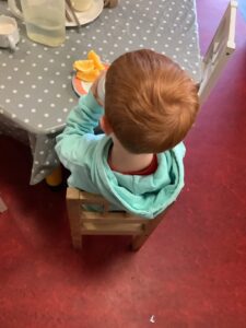 Children are becoming more confident when taking part in lunchtime and snack routines as they collect what they need with little support and carry their tray to the table and choose who they want to sit next to.