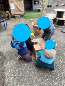 Today a group of children have chosen to work together to decorate a box outside. They recalled an activity they did last month that they wants to revisit… “I want to make another surprise box so we can sneak up and watch mr robin in the garden”. The children then decided they wanted to play hide and seek where they discussed counting from “number 0 because 0 means nothing” 🐦