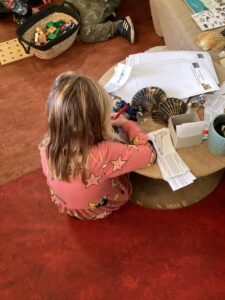 Today Florence and Rosie got creative in the art area and created different items for their teddy bears. Rosie created a tie for her bear and Florence created collars