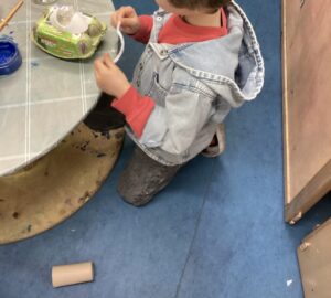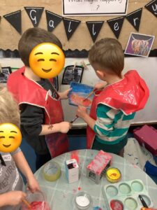 Today inside a group of children have been experimenting with the paint by mixing colours to enhance their artistic skills. They developed their motor skills by using the paint brush to confidently mix the primary colours yellow and red and used their colour recognition to understand it changes to orange. 🧡