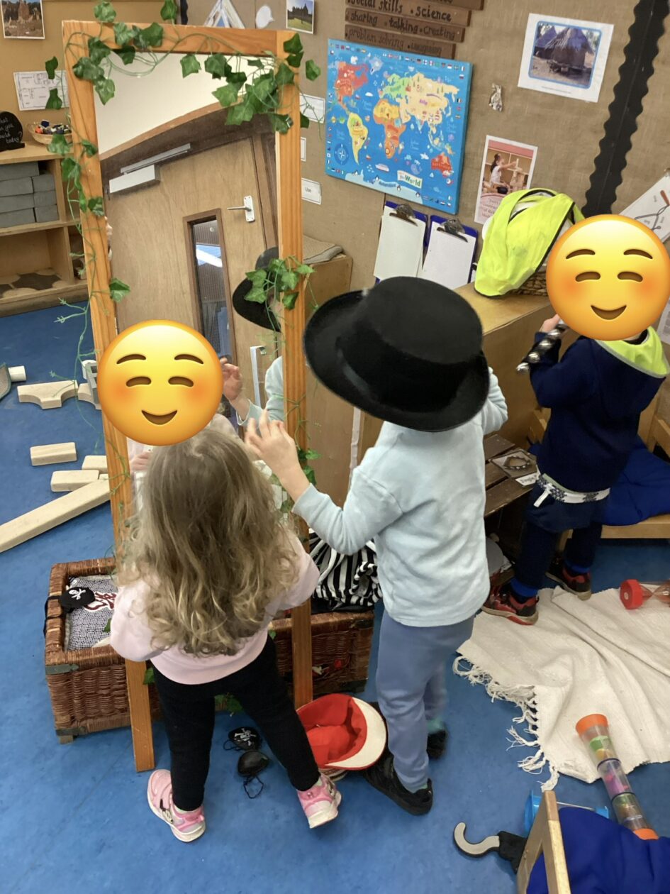 Today inside a group of children were exploring the dressing up area. They used different outfits and discovered their look by looking in the mirror. They enjoyed making funny faces in the mirror to each other. 🪞