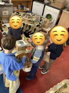 This afternoon inside a group of children played cooperatively for a long time through a role play experience. They demonstrated different roles people have in the community as they role played shops. They confidently shared resources and negotiated with each other when more than one person wanted one object. They all took part in discussions about what you find in a shop. They worked as a team to collect items around the nursery to create their shop. They discussed amount of foods they found and confidently showed one to one correspondence by counting out the books they chose to display in their shop. The group of children had opportunities to have experience of giving and receiving change through their role play experience. They were able to vocalise that in a shop you can use money or a card to pay for their items. They discussed shopping lists which we are going to explore over the next few days to promote mark making within their role play experience.