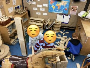 Today inside a group of children got creative in the block area. They each had their own idea of what they were building using lots of different sized and shaped blocks as well as loose parts. There was a creation of a superhero, a girl, and a house for dinosaurs. 🧱