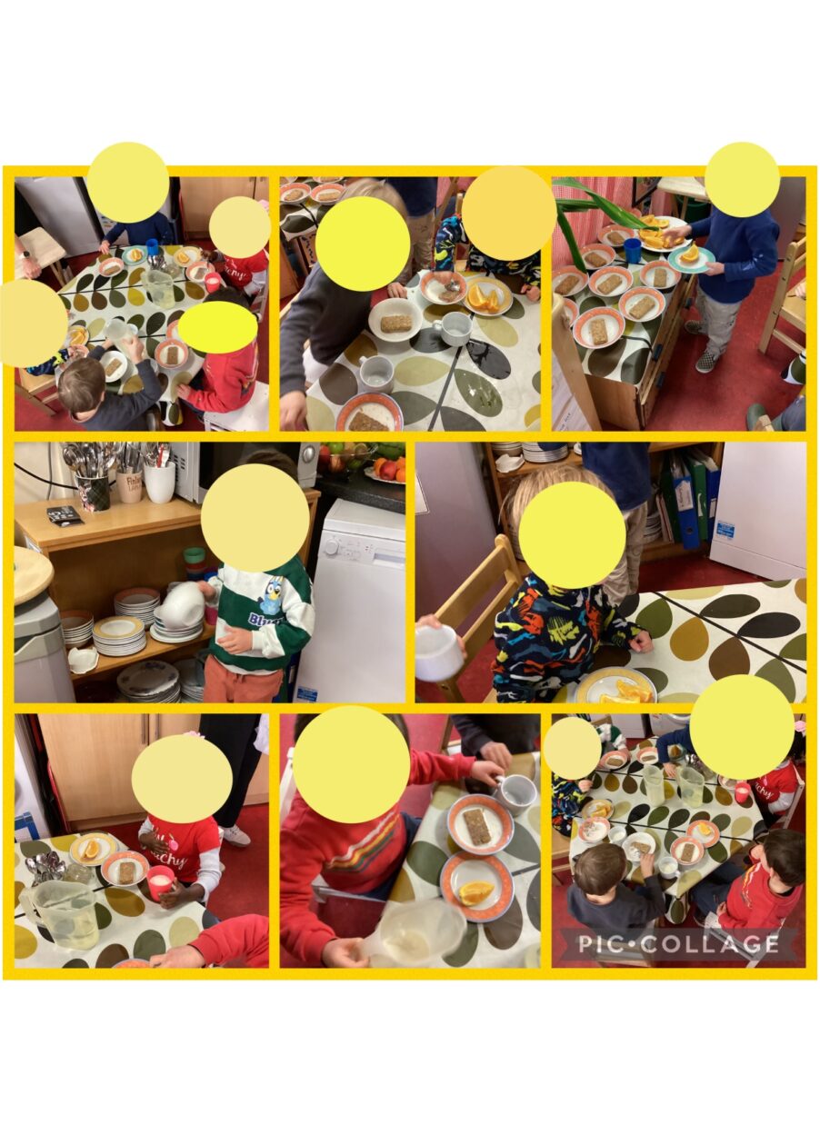 Today a group of enjoyed a nice sociable snack at the snack table. They all independently collected their crockery and followed the number dots to allow them to collect the correct amount of snack. They discussed their favourite part of snack which today the favourite was the cereal. 🥣