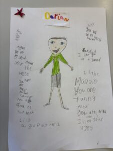 We made melted snowmen using paint, sponges, paper and googley eys. We then created and wrote short stories about how our snowmen had melted. We loved sharing these with the class! In RME we looked at the Christmas story with Miss Good.