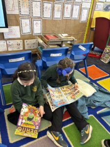 Our topic is about local community. We have been thinking about the needs and wants of ourselves and the community. We are linking these to our rights. We thought about who helps us in our school community and we interviewed Rory the janitor and Sheila the cleaning lady this week. We learned how to write and ask open questions. We also asked how we could make a difference and help them. We are litter picking and collecting leaves in the school playground.