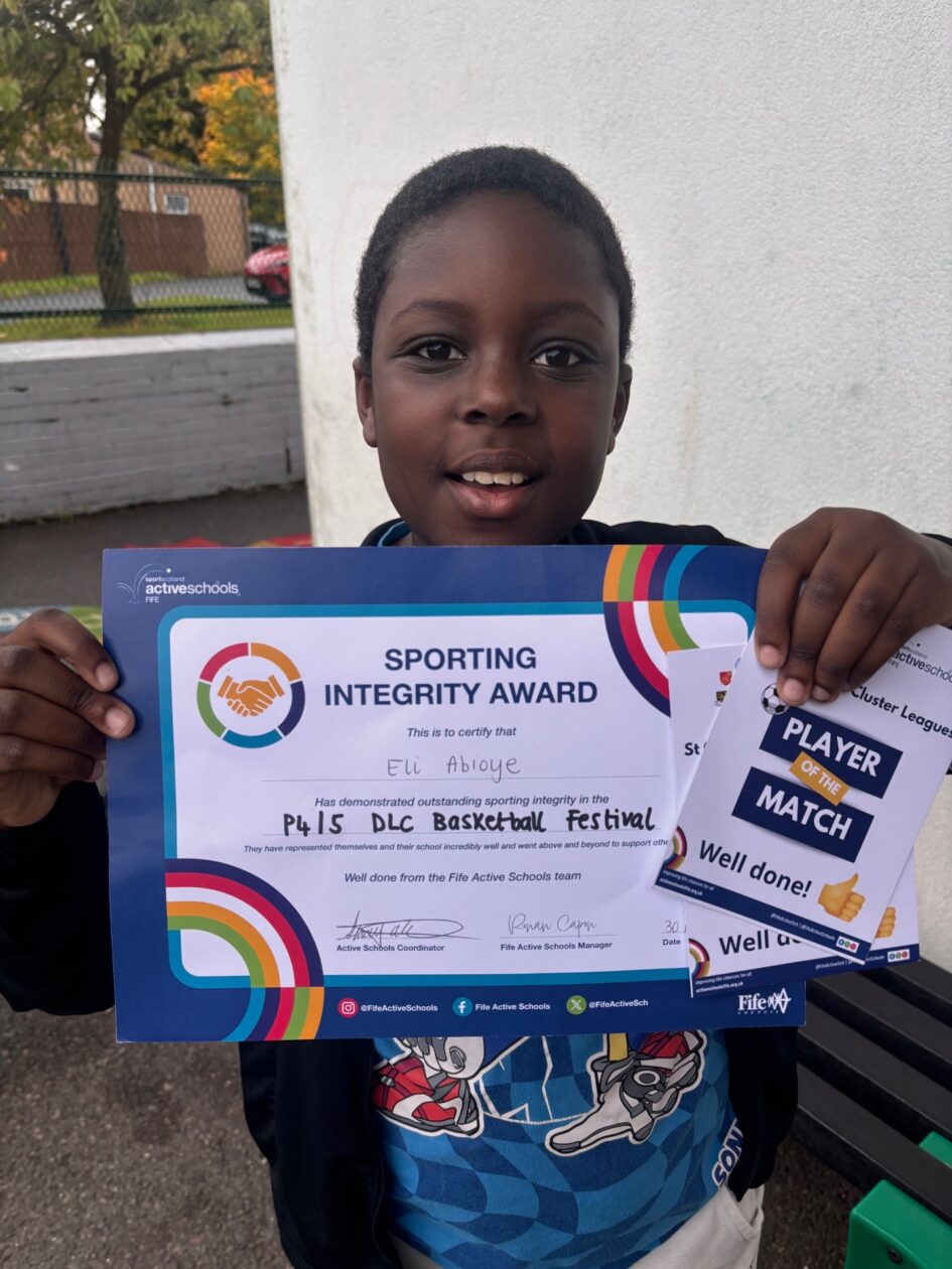 We were delighted that our basketball team from P4 & P5 were able to take part in a tournament at the Dunfermline Learning Campus. The team played so well together and won 4 out of their 6 games. There were player of the match cards awarded to our wonderful pupils. One of our pupils even received the Sporting Integrity Award of the tournament and we are very proud of him.