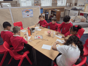 Photo of younger members preparing for our Skin Colour Assembly. We all tried to mix paint to match our skin colour, drew around our hands, and painted them to show in assembly and display in school.