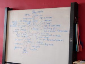 We started reading our class novel. It’s a horror story called Coraline. We want to find out what the ‘other’ parents are like and if Coraline will survive. We brainstormed all the characteristics that villains in books and movies share: