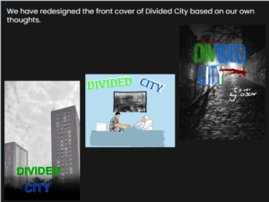 Following these discussions, Primary 7 took on a creative challenge: redesigning the front cover of Divided City. The children worked hard to create designs that reflected the themes, setting and mood of the story. The results were fantastic, with lots of imagination and attention to detail on display.