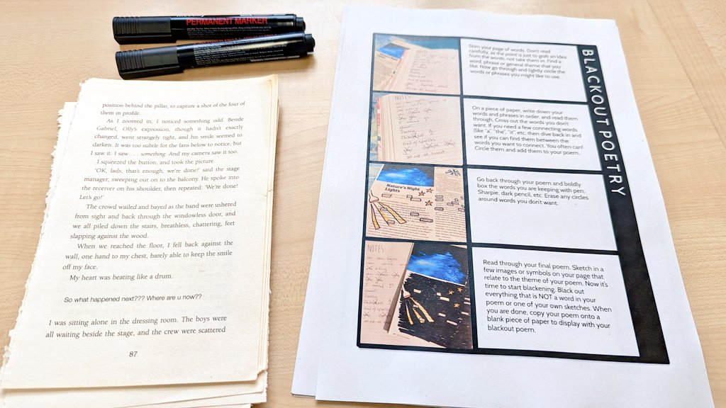 Meanwhile, at our activity station, students have the opportunity to engage in a wide variety of creative projects, including some wonderful worksheets by National Poetry Day UK and a dedicated blackout poetry workshop. Armed with markers, they transform pages from old books into new poems, discovering hidden meanings within the text. It’s a fun and creative exercise that encourages close reading and critical thinking. The results are often breathtaking.