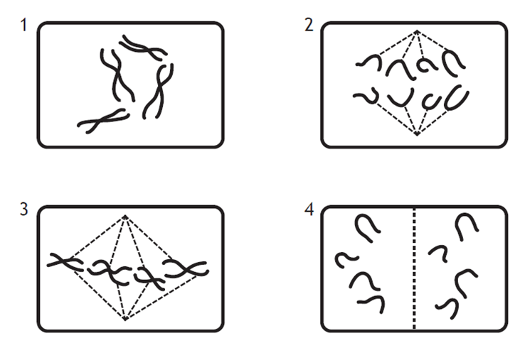 | 11. | The following diagrams show a cell at four different stages of mitosis.