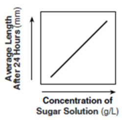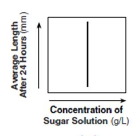 | 4. | Students cut 20 rod-shaped pieces of potato of the same diameter and length. Five pieces of potato were placed into each of four beakers containing different concentrations of sugar solutions. Each potato piece was measured again after 24 hours. The table below shows the results of their experiment.
