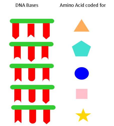 The information in the table below shows the DNA base sequences which code for five amino acids. Use the informtion in he table to answer questions 11, 12 & 13.