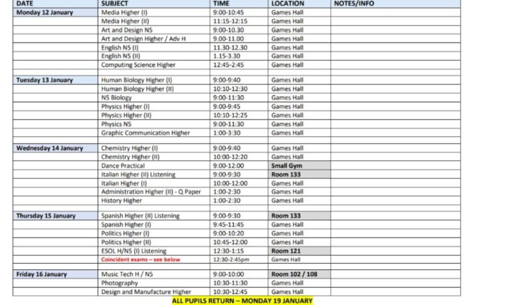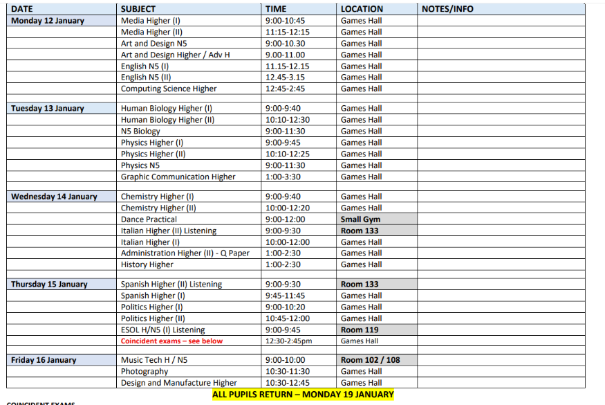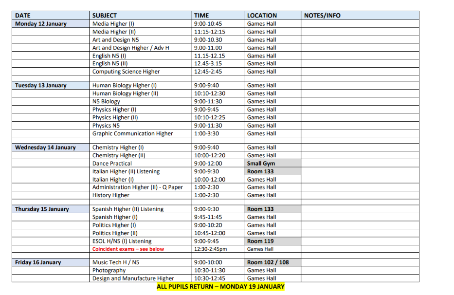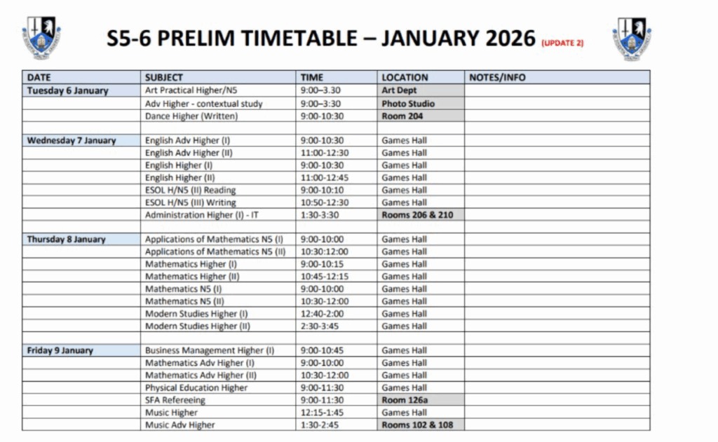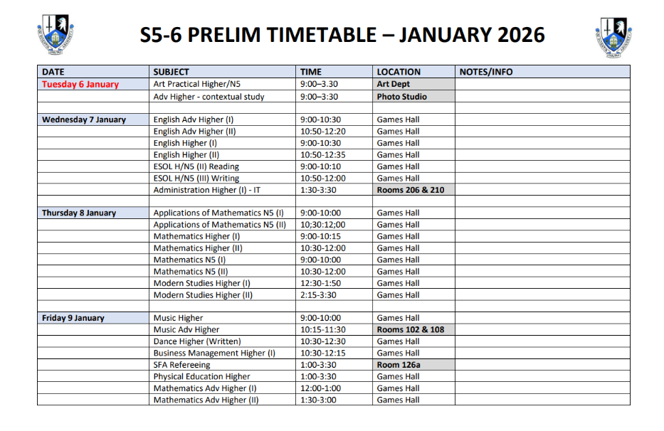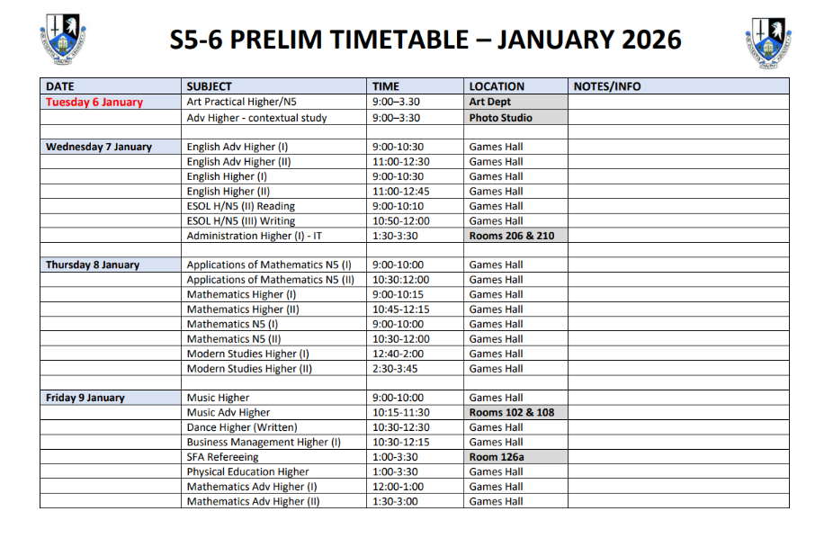 PRELIMS – S5/6 prelims will start on Tuesday 6 January 2026 and end on Friday 16 January 2026. Please find the timetable attached: