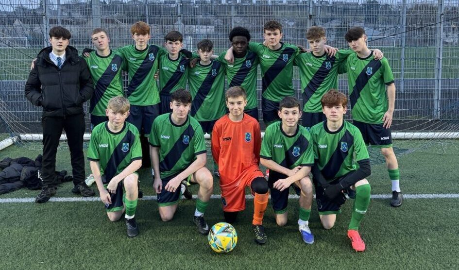 Over the last few months the Health and Wellbeing department have been seeking donations and sponsorship for new strips for the PE department. Through kind donations and sponsorship we have managed to get 2 brand new sets of bespoke football strips for our teams. Highlighted in the picture above is our S3 Under 15 football team wearing the new strips in a recent match.