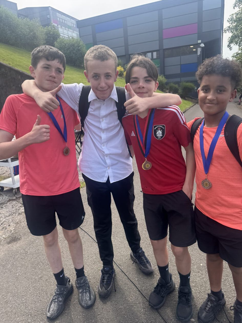Over the last few months the Health and Wellbeing department have been seeking donations and sponsorship for new strips for the PE department. Through kind donations and sponsorship we have managed to get 2 brand new sets of bespoke football strips for our teams. Highlighted in the picture above is our S3 Under 15 football team wearing the new strips in a recent match.