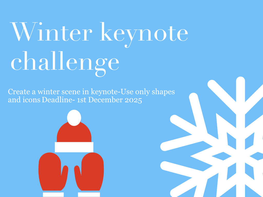 This year, the Digital Leaders wanted to bring back monthly challenges. Our first challenge is to create a Keynote with a winter theme, using only shapes and icons. This is for P5-P7.