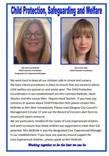 The Child Protection Coordinator for Mosspark Primary School is Catriona McBride, Head Teacher. In her absence the role is carried out by Louise Weir, Depute Head Teacher.