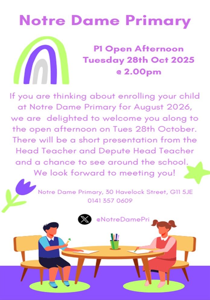 If you live outside our catchment area, you are very welcome to submit a placing request to join Notre Dame Primary. Please remember that you must first complete the online enrolment process. More information can be found here: