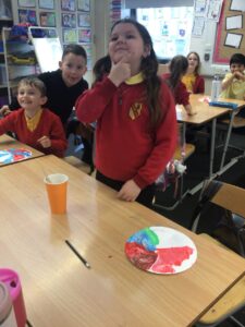 December is upon us! Last week, the children wrote a recount piece of writing with an introductory, main, and concluding paragraph about their pantomime trip. Also, we moved onto the arrays strategy to calculate multiplication problems in Numeracy and began learning about the Bethlehem story in RME. In a Talking and Listening activity, the children had to carefully listen to their partner to draw exactly what and where they described on their paper – some are pictured below! We also created Christmas themed lollipops using paper plates, paint, glitter, and skewers which is also pictured below!