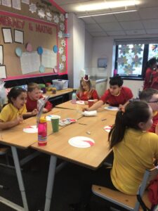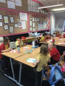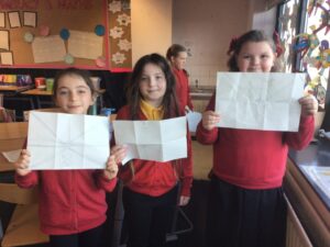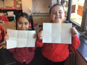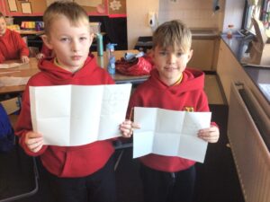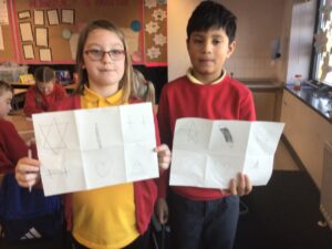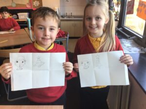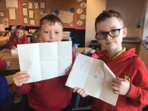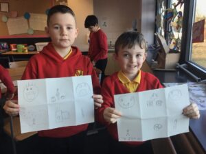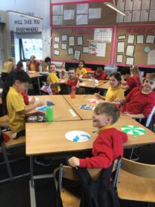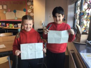 December is upon us! Last week, the children wrote a recount piece of writing with an introductory, main, and concluding paragraph about their pantomime trip. Also, we moved onto the arrays strategy to calculate multiplication problems in Numeracy and began learning about the Bethlehem story in RME. In a Talking and Listening activity, the children had to carefully listen to their partner to draw exactly what and where they described on their paper – some are pictured below! We also created Christmas themed lollipops using paper plates, paint, glitter, and skewers which is also pictured below!