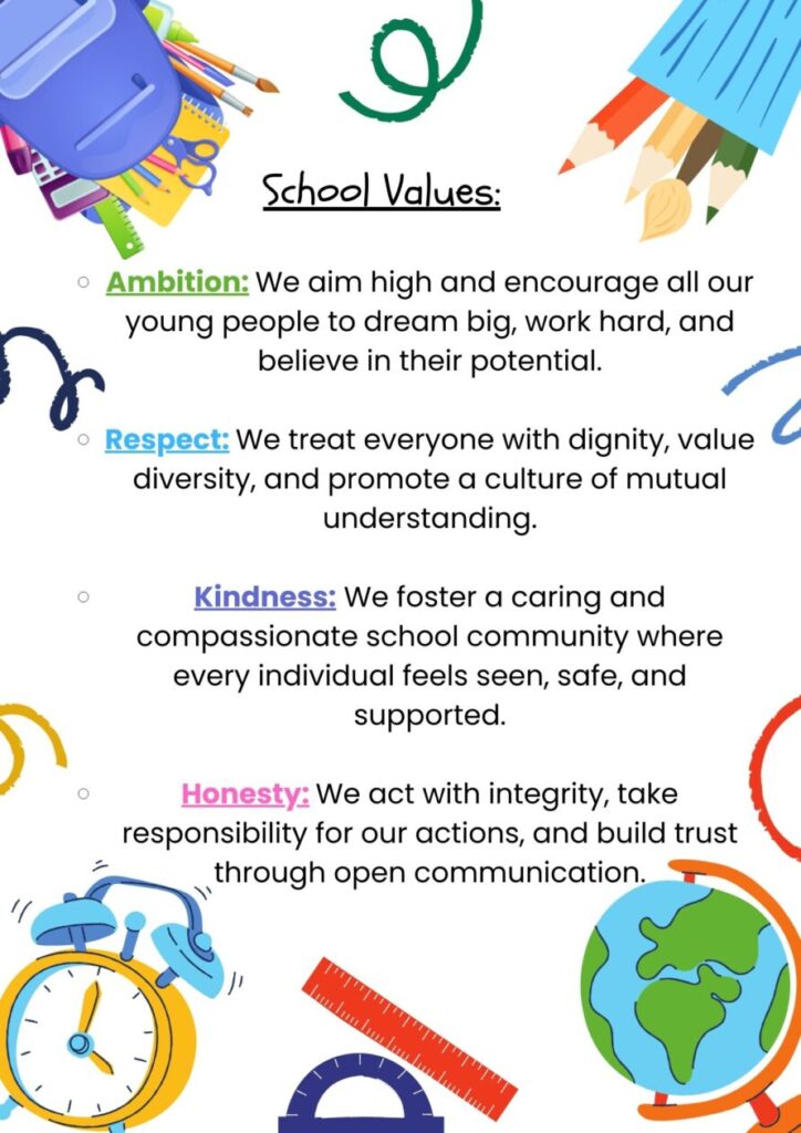 Our vision is ‘To provide a nurturing, excellent, and equitable learning environment where every young person is empowered to reach their full potential and supported into a positive and sustainable destination’ — captures our ambition for every learner. Underpinned by our values of Ambition, Respect, Kindness, and Honesty – this vision reflects the collective aspirations of our community and sets a clear direction for the future of our school.