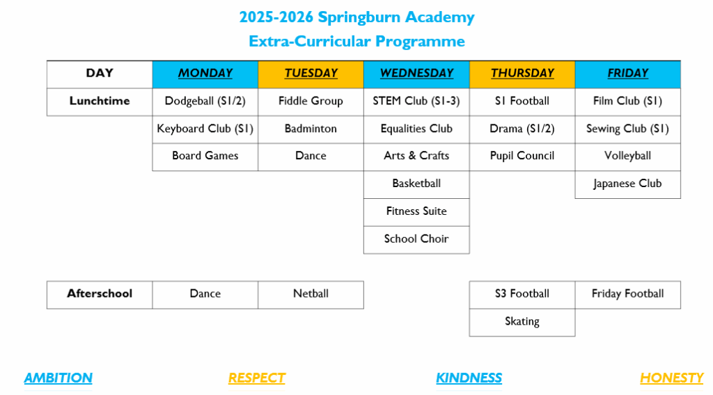 We are going to host an Extra-Curricular Fair on Thursday 2nd October at 1.30pm in PE to give all of S1-S3 the chance to see all of the exciting Extra-Curricular opportunities available to our young people! We have taken onboard feedback from our S1-S3 pupils, on what they would like to see offered in Springburn Academy. This event will allow pupils to find out more information on the range of clubs offered at lunchtime and afterschool. Our whole school Extra-Curricular Programme will then be officially starting from