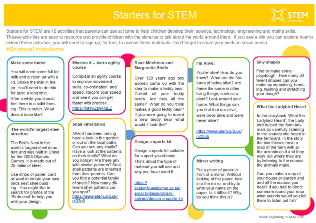 Also, STEM learning UK have some fantastic Starters for STEM grids full of activities at home. Click here for: