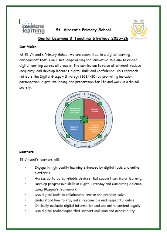 At St. Vincent’s Primary School, we are committed to creating a digital learning environment that is inclusive, empowering, and innovative. Our goal is to embed digital learning across all areas of the curriculum to raise attainment, reduce inequality, and develop learners’ digital skills and confidence.