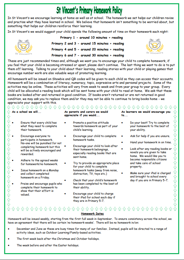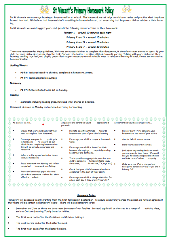 At St. Vincent’s, we believe that learning at home forms an important part of a child’s education. Our Homework Policy explains how we support pupils to revise and practise what they learn at school in a manageable and positive way. Please see the image below for full details.
