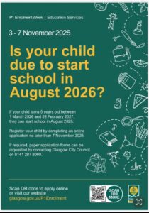 P1 registration for children starting school for August 2025 will take place from: Monday 3 November 2025 – Friday 7 November 2025.