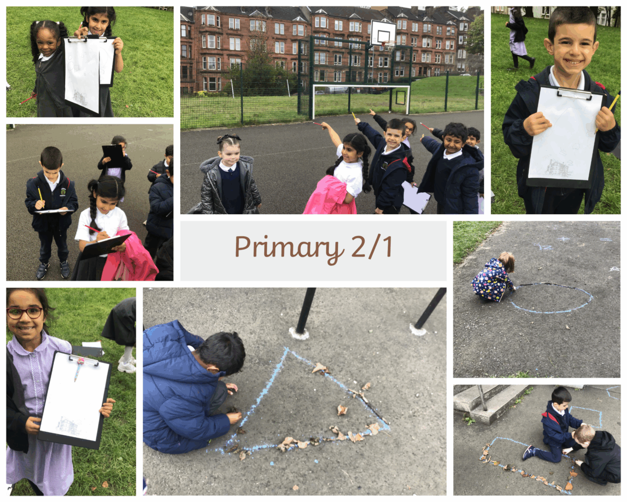 Primary 2/1 were learning all about 2D shapes outdoors. They spotted shapes around them, made a shape map of their playground and made big shapes with natural materials from around the playground.