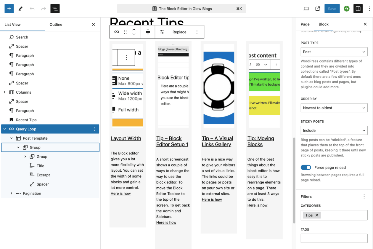 For example our home page uses the Query Loop block to show the last four tips. For each post it shows the featured image, the title & and excerpt.