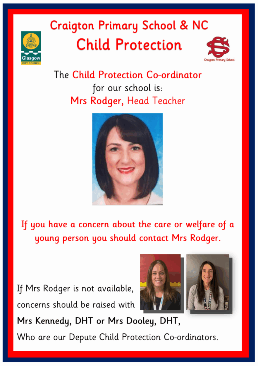 Child Protection is everyone’s responsibility. Here at Craigton Primary we have very clear procedures to ensure that all children are safe at all times. Please see the information below that outlines our procedures.