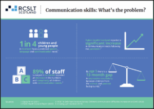 Communication Skills: What’s the Problem and Why does it Matter?:  Infographics co-produced with the Royal College of Speech and Language Therapists (RCSLT) outlining the scale of the current SLC crisis across Scotland and the potential destructive and costly impact for long term life outcomes