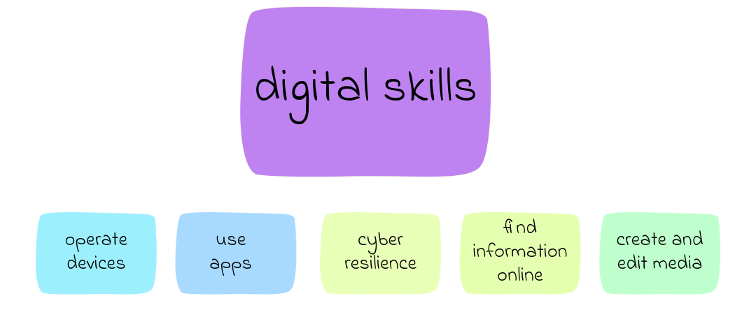 Digital skills are required to use digital technology to access services and information and to actively participate in society, this includes but is not limited to:
