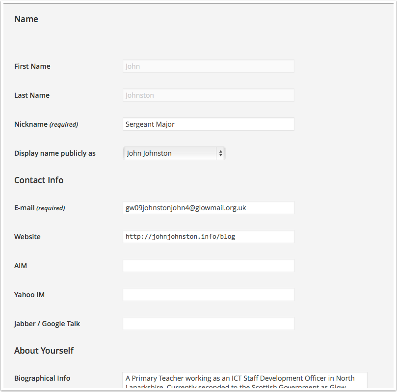 Biographical Information: some themes use this and will display it on the author’s page. You can see the author page by clicking on an Author’s name on a post. This page will show all their posts.