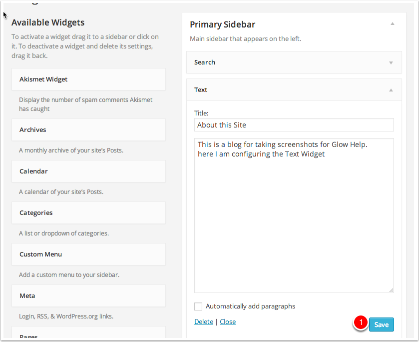 After adding widgets many need to be configured. For example adding a text or about widget will need some text filled in. The Widget will need to be Saved [1] too.