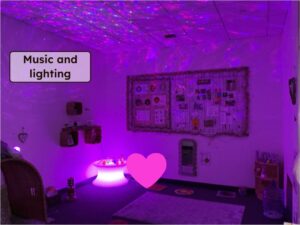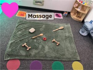 Some children like to talk and name the textures. Following on from TAC PAC we also use our sensory room for all children and we offer calm massages. The children are introduced to the concept of respect, they are asked if they would like a massage. They get to choose whether they would like the rollers or spoons etc. The children use songs and calm voices to support their friends, then ask them if they feel calm or happy. If you would like more information on this approach please refer to Tacpac.co.uk. There are also videos available on youtube for story massage and TAC PAC .