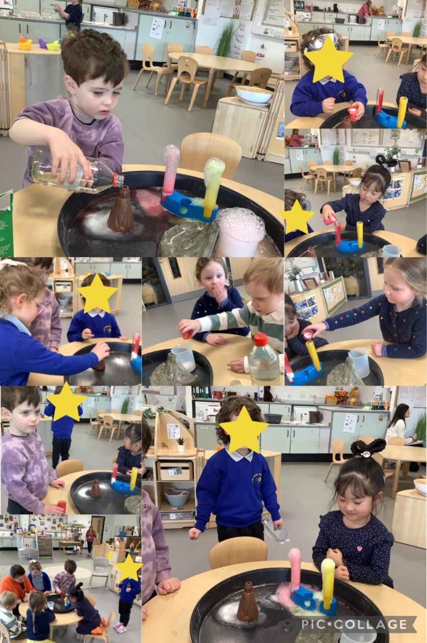 The children took part in a volcano experiment. Beforehand we discussed what a volcano is and what might happen and how this will change the environment after it erupts.