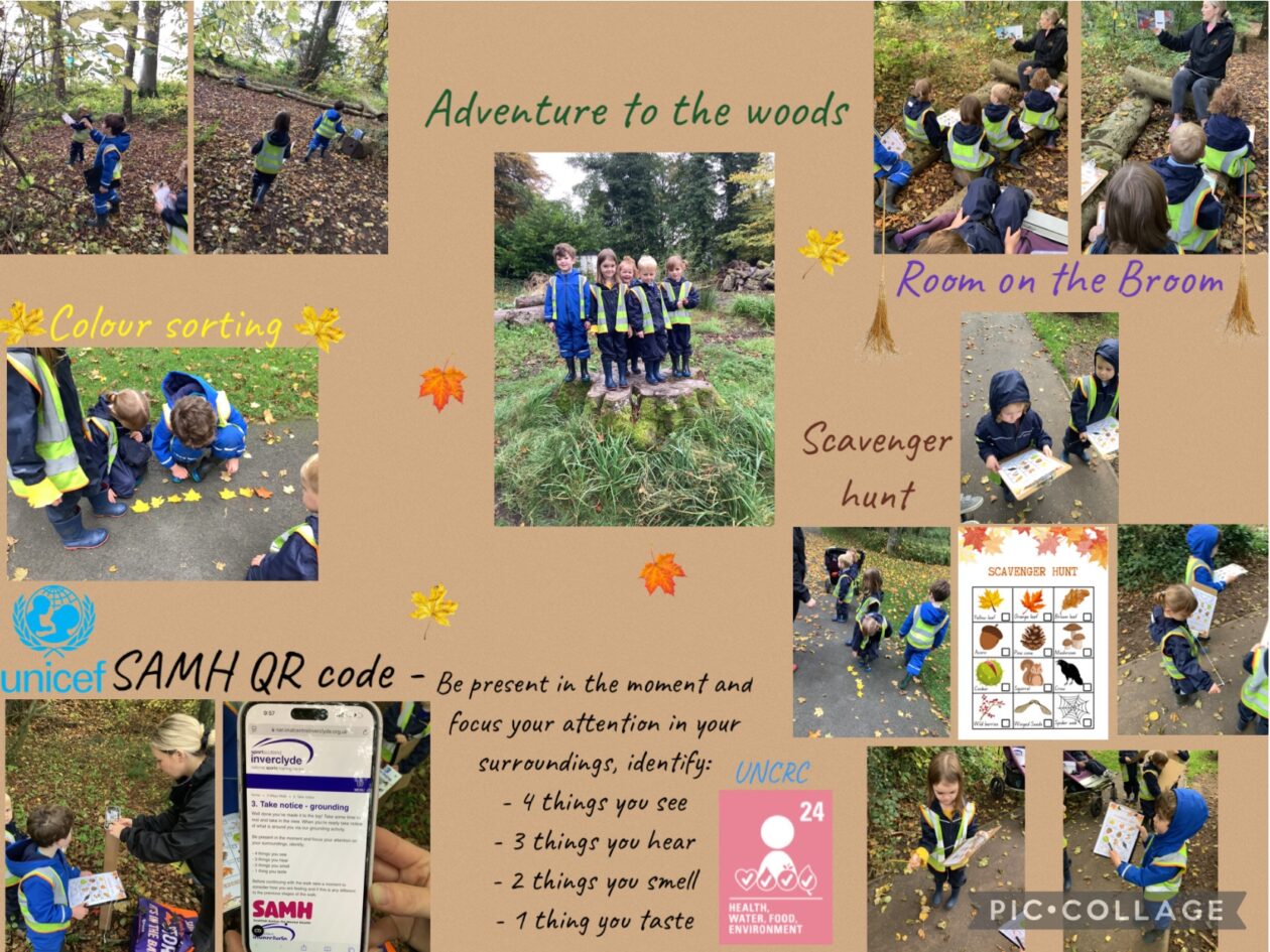 During our scavenger hunt we came across a QR code, after scanning the code we were provided with information on taking notice of your surroundings and ‘grounding’ yourself. This was supported by SAMH (Scottish Action for Mental Health) Most of the children were able to answer and identify at least one sight, sound or smell within the woods. This experience gave us time and space to think about our surroundings, gather thoughts and create a calming environment.